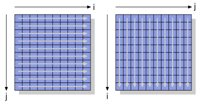 我们将使用一个 新的测试来观察非时域指令的实际表现,这个测试将会测量针对二维数组组成的矩阵的写操作。编译器会将矩阵在内存进行布局,使得最左侧的(二维数组的第一个)索引用于寻址内存中连续的一行,右侧的(二维数组的第二个)索引用于索引行内的每个元素。测试程序有两种方法遍历矩阵,其一是在内层循环中递增列索引,其二是在内层循环中递增行索引,所以我们便有如图6.2所示的行为(译者注:注意分别看i和j的位置,i意味着外层循环,j意味着内层循环):