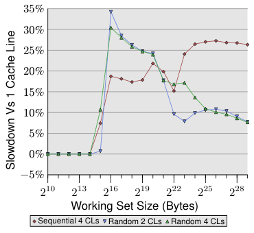在随机内存访问的情况中起相关数据则有点不同。当工作集能放进L2缓存时有25%到35%的降速。在此之上则会有大约10%的降速。这不是说代价变小了,而是实际内存访问变得不成比例的更昂贵。数据显示,在某些情况下,元素之间的距离确实会有影响。Random 4 CLs曲线显示由于使用第1和第4缓存行,其会付出更高的代价。