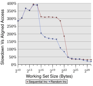 对于一个很大的工作集,非对齐访问依然会造成20%到30%的影响,考虑到对齐访问这样大小的数据时耗时很长,这个影响已经不可不谓不大了。这个图标应该展示了对齐必须被认真对待。即便处理器架构支持非对齐访问,也必须视“它们不像对齐访问那么好”。