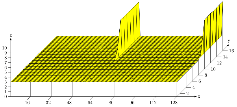 在此图中,那个熟悉的测试用例6设NPAD=15(译注:参考第三部分文章,第3.2节),并使用特殊的设置来进行测量。X轴表示列表中两个元素之间的距离,以元素个数为单位进行测量。换而言之,距离2表示下一个元素在前一个元素后面128字节的位置。所有元素在虚拟内存空间内以完全一样间距进行排列。Y轴表示列表长度,当前仅用到1到16,表示工作集从64字节到1024字节不等。Z轴表示遍历每个元素所需的平均时钟周期。