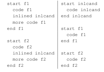 内联也可以被单独控制。编译器有启发式方法和限制来指导内联过程;这些限制可由程序员控制。-finline限制选项指示了一个函数多大时会被视作过大而不适合内联。如果一个函数在多个地方都有调用,那么内联它会导致代码体积爆炸。假设有一个叫inlcand的函数会被f1和f2函数调用,而f1和f2则会被顺序带调用: